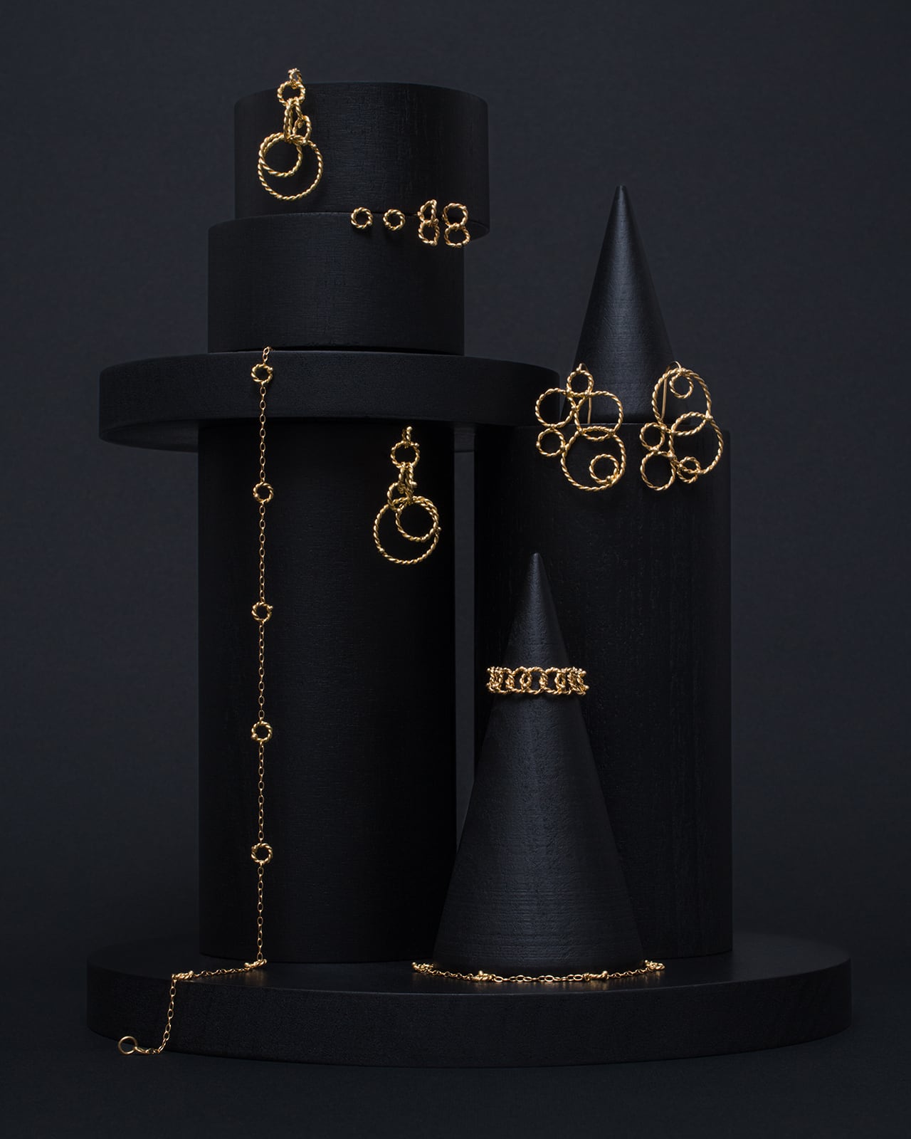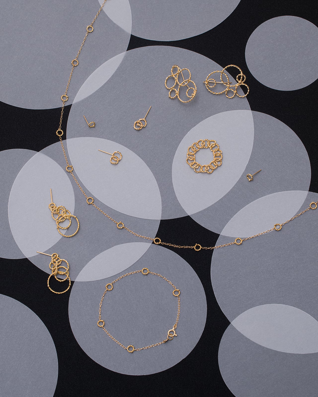 手作業による18金の繊細な線を組み合わせ、柔らかな揺らぎと軽やかな立体感を表現しました。